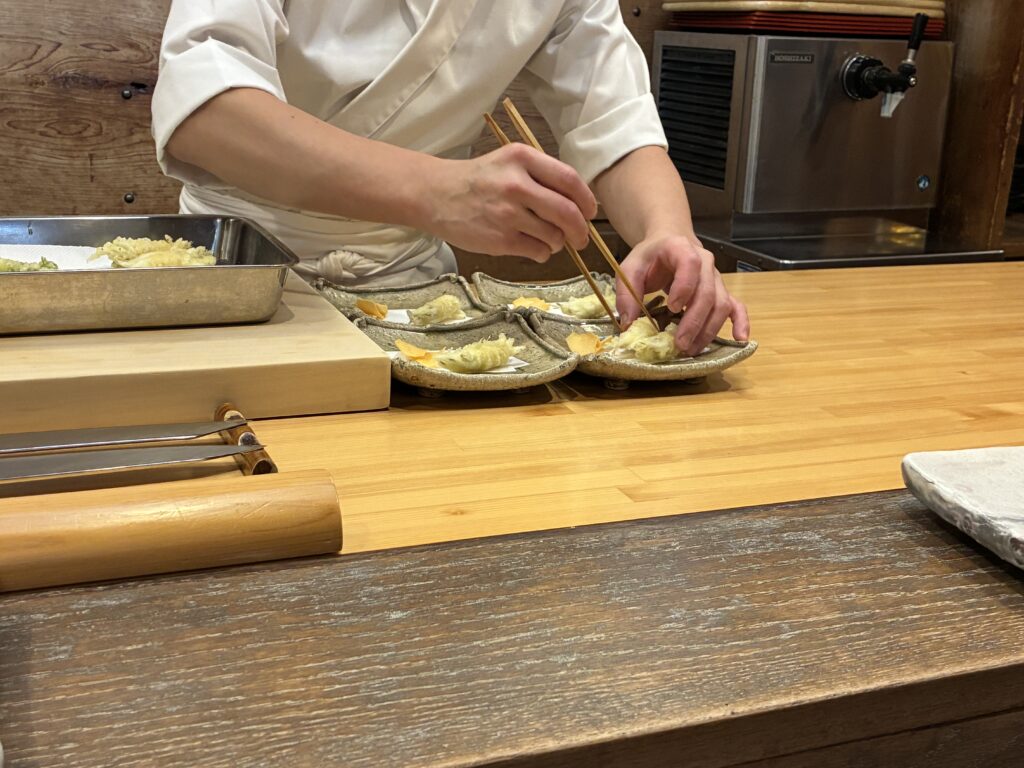 タラの芽と白魚の天ぷらと”くわいのチップス”の登場です!
