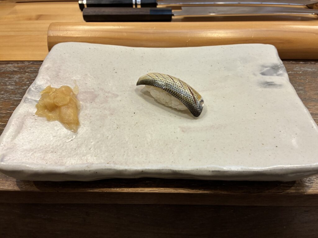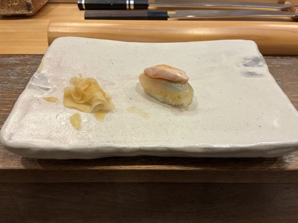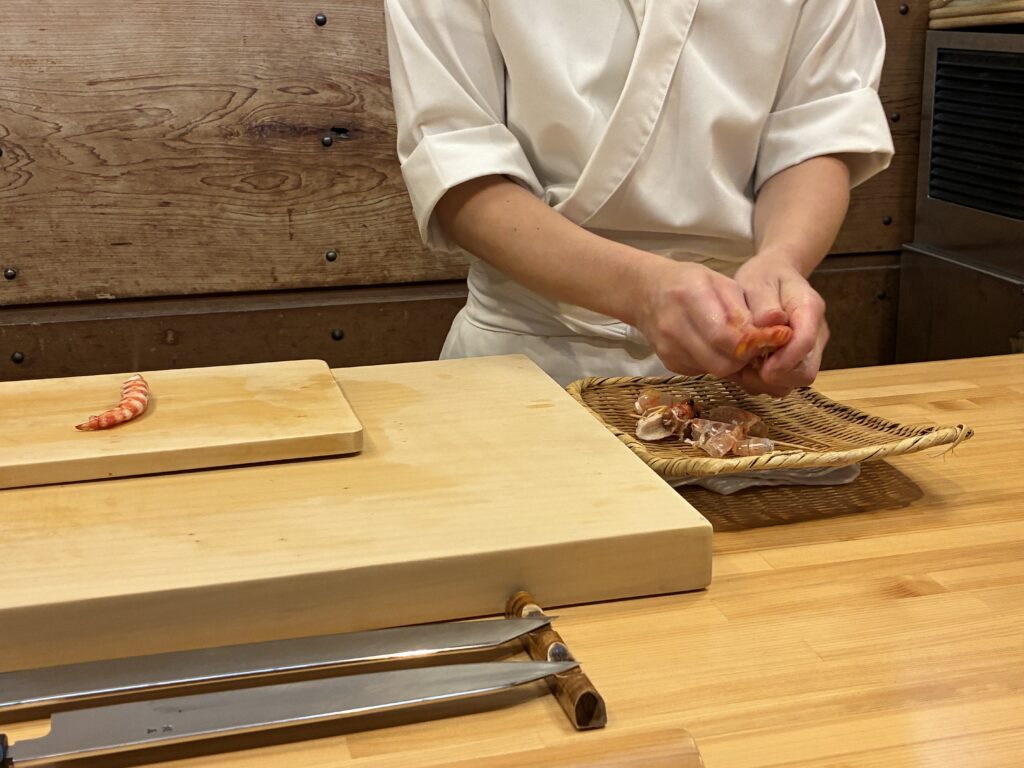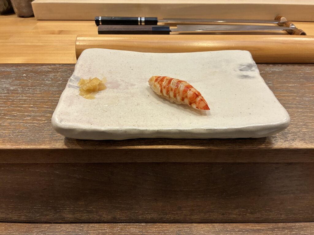 こはだを挟んで、先ほどまで水槽で生きていた海老がいつの間にか茹でられていて…。