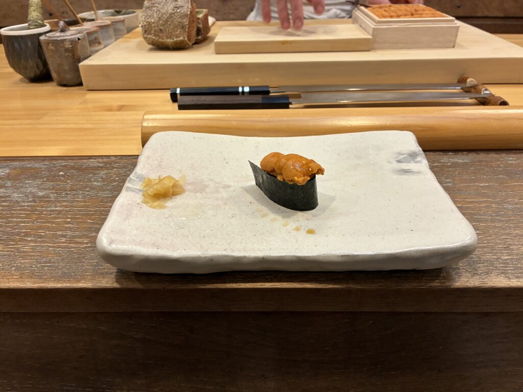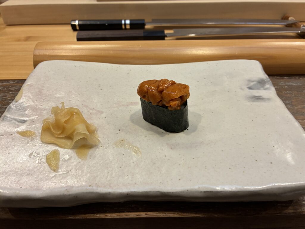 ウニの食べ比べと、カワハギの肝も載った一貫。